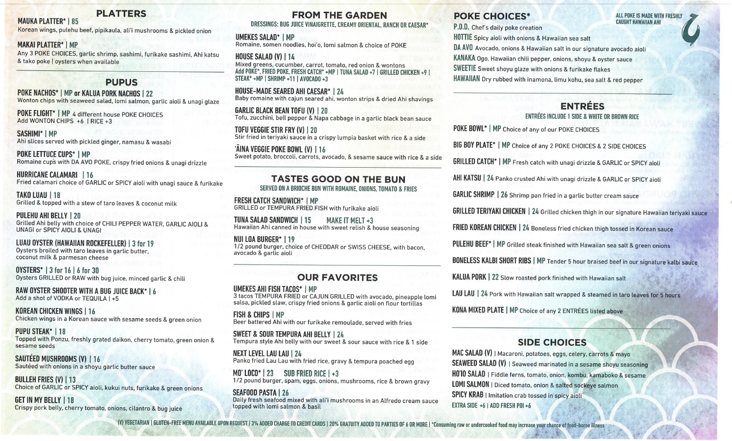 Add POKE*, FRIED POKE, FRESH CATCH* +MP | TUNA SALAD +7 | GRILLED CHICKEN +9 | STEAK* +MP | SHRIMP +11 | AVOCADO +3